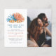 This coastal-themed engagement party invitation is ideal for couples who love the sea. Featuring the words "TWO LESS FISH IN THE SEA" in a blue sans-serif font beneath two clownfish and blue and orange coral reefs. A simple, yet modern typography displays your wedding details with your names highlighted in an orange hue to the left, and a custom photo to the right. Reversing to a nautical pattern with rope, coral reef, and fish. As part of the budget selection here on Zazzle, these invitations come in limited sizes and paper stocks. If you need a different size or paper stock, this design can be transferred to a standard 5x7 format using the design transfer tool for more options.