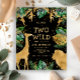 Celebrate your little wild thing's second birthday with this jungle safari themed invitation, featuring gold faux foil animals (giraffe, lion and monkeys), gold and green jungle foliage, and a sprinkling of gold confetti. Add your child's name and party details in gold coloured text on a black background. A coordinating jungle foliage pattern in green and gold on a black background decorates the back of the card.