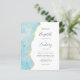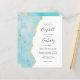 The left-hand edge of this elegant modern wedding invitation features an aqua blue watercolor agate border trimmed with faux gold foil. The customizable text combines handwriting, copperplate and italic fonts in charcoal gray on a white background. The reverse side features a matching aqua and gold watercolor agate design.