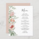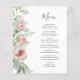 The left-hand edge of this romantic wedding menu features watercolor floral bouquet of peach and blush flowers and greenery. The customisable text combines handwriting, copperplate and italic fonts in charcoal grey on a white background. The reverse side features a coordinating solid colour.