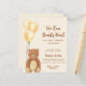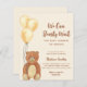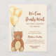 This cute baby shower invitation is decorated with a watercolor teddy bear and balloons on a soft beige background.