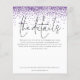 Wedding Details Purple Glitter Confetti Enclosure. A budget price 4.5” x 5.6” alternative to let your guests know all the details. Available in a SEMI GLOSS 110 lb CARD STOCK which is the default option (recommended for invitations), OR a SATIN FINISH 80 lb THINNER PAPER STOCK (ideal for enclosures). Envelopes are an optional extra and are slightly larger than the card size. Let your guests know details such as directions and accommodation information for your wedding when you send their invitations. This elegant design has set stylish large typography for the heading The Details and the rest of the text can be easily personalised to your words. A purple faux glitter border is at the top on both sides. You can choose any colours of your choice for the text and background colours on both sides via the customise further option.