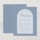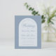 A modern wedding invitation. On a dusty blue background, it has white arch with dusty blue text in it. The word Wedding and the names are written in an elegant calligraphic script, the first line is arched text.