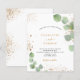 A white background decorated with eucalyptus greenery and faux gold glitter dust. Personalise and your name and ceremony details. Black and golden coloured letters.