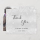 A wedding thank you card. A faux silver metallic looking background colour. With faux glitter dust. On front, a large hand lettered script and the text: Thank You, your names and a date.