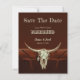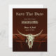 Budget western cowboy brown wood wedding save the date card. Fun rustic country bull cow skull invitations. Cute, funny farmhouse style design. Text can be personalised. Old wild west antique vintage unique. Cool, trendy farm animal. Customise script and typography. Image copyright Marg Seregelyi Photography.