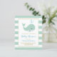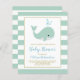 This sweet gender-neutral drive-by baby shower invitation features a cute mint green whale spouting blue water drops. The words "Baby Shower" and the customisable name of the mum-to-be appear in matching blue handwriting font. Beyond the faux gold rectangular frame is a background of mint green and white stripes.