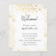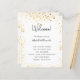 A modern, elegant wedding program, timeline. A white background decorated with faux gold glitter dust. Personalise and add your names and wedding details. Black coloured letters. If you have more text it's possible to reduce the line space.