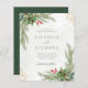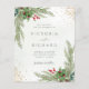 Beautiful affordable Save the date card featuring hand-painted botanical watercolor illustrations of winter greenery, pine and spruce branches, cones and holly berries with gold glitter. Perfect choice for winter or Christmas holiday themed weddings.
