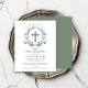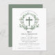 Elegant choice for a boy's First Communion invitation. An sage green botanical eucalyptus wreath frames a simple cross at the top. All of the text can be edited.