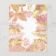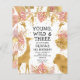 This "Young, Wild & Three" jungle safari themed girl's third birthday party invitation features gold faux foil animals (giraffe, lion and monkeys), gold and pink jungle foliage, and a sprinkling of gold confetti on a white background. Add the name of the birthday girl and party details in black text. A coordinating frame pattern of pink and gold leaves appears on the reverse.