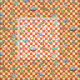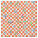 A pattern drawing of budgies in cute manga style with orange chequered pattern for the background. Featuring many budgie mutation colours: green, yellow, white, blue, violet and mauve.