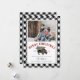 Illustration of a buffalo wearing a santa hat with a snow covered Christmas tree tied to its back. Border and reverse side are black and white buffalo plaid pattern design. Personalize with your family photo.