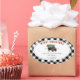Illustration of a buffalo wearing a santa hat with a snow covered Christmas tree tied to its back. Border is black and white buffalo plaid pattern.