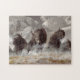 A herd of bison thunders over a over a hill kicking up sprays of dirt and snow. As they charge towards you, the steam from their breath merges with the layer of mist that blankets the wintry ground. Behind them, great snow covered mountains loom above an evergreen forest, their peaks jutting into the air where huge clouds roll across the sky.
