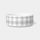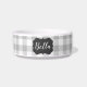 Grey Buffalo Plaid Personalised Pet Name on a small ceramic food or water cat or dog bowl with your new puppy dog or kitty cat's name in a calligraphy script font inside a faux light black chalkboard look fancy shape label. The farmhouse chic style in neutral colours will look great in a rustic or modern kitchen.
