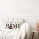 Add a little rustic farmhouse charm to your holiday home this season with this red and black Buffalo plaid Christmas tree Home pillow that has a background of white-washed woodgrain look wood slats or shiplap with black letters for the H M and E with the red and black Buffalo Plaid Christmas tree standing in place of the letter O.