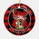 An image of an antlered buck deer wearing a red and white striped Santa hat is at the center of this Christmas ornament. The image is placed on a bright red paint splatter background and framed in white. The text, also in white, has your name and address on a red and black buffalo plaid circle border. The back of the ornament has the same image, with one more text field for you to customize.