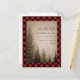 A wedding save the date featuring an illustration of evergreen trees over a brown background with a red and black buffalo plaid border.