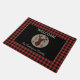 A buffalo plaid silhouette antlered deer head is at the centre of a tan circle on this attractive door mat. Opposing black arrows are on each side of the head. The circle is placed on a black background, which is framed with a matching red and black buffalo plaid border. Your custom text is in matching tan above and below the circle and deer image. Perfect for a cabin, or country home, but comfortable at home in the city, too!