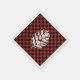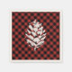 Napkins featuring a red and black heritage (buffalo) plaid pattern on front. Centre features a white illustration of a pinecone.