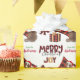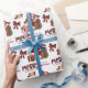 The repeated pattern on this cute Christmas wrapping paper is an image of a red and white Australian Shepherd Dog wearing a Santa hat, with a black and red buffalo plaid pillow behind him, and a coordinating gift package with a gold ribbon beside him. There's also a buffalo plaid bow and the matching text that says "JOY". Stylised red and black buffalo plaid text says MERRY CHRISTMAS", and your own signature is in two fields for you to customise.