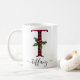 Black and Red Buffalo Plaid T Monogram Xmas Coffee Mug featuring a cute A initial letter with a buffalo plaid pattern and mistletoe watercolor element. The custom name template under the T monogram is in a swirly handwritten calligraphy font with flourishes. Give a thoughtful personalised Christmas mug as a winter holiday gift or stocking stuffer. For a different monogram letter check out the "Other products from this collection" section below.