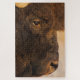 Close up photograph of a Buffalo’s face. Taken at Antelope Island State Park in Utah early in the morning. The blue morning sky can be seen reflected in his eye.