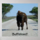 A buffalo proudly stands in the middle of the road, daring you to try to go by.