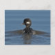 A lovely female Bufflehead duck swimming away from the camera on dark blue water.