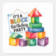 A joyful birthday party scene filled with laughter and creativity as children build towers and structures using colourful building blocks. Brightly coloured cubes, cylinders, and triangles spark imaginative play, teamwork, and hands-on fun in a cheerful and engaging environment. Perfect for a playful celebration that encourages learning and friendship.