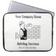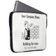 Building company laptop sleeve has an illustration of a builder as well as the building business details. Builder laptop cover. Building services promotion on a personalised computer sleeve