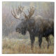 Bull moose in snowstorm with aspen trees ceramic tile