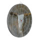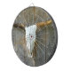 A Bull Skull shot closeup that's bright and colourful . That's on a DART BOARD.