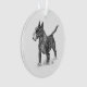 A hand-drawn ink illustration of a Bull Terrier featured on a clear acrylic circle ornament, perfect for dog lovers. This design is created from my original artwork, and all rights are reserved.”