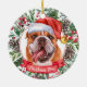 This sophisticated ceramic Christmas ornament features a bulldog with his tongue hanging out in a Santa hat, surrounded by holiday greenery, pinecones and berries, with a red banner with your pet's name (or change to Merry Christmas). You can fully personalise this design by changing the greeting and year on the back in an elegant font. This is a stylish, yet inexpensive, custom Christmas ornament, and it's perfect for bulldog lovers, dog lovers, or pet lovers.