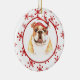 On the front of this Holiday ornament is a beautiful watercolor image of a Bulldog wearing a red and white striped Santa hat. The image is placed on a white oval framed by a retro red snowflake pattern. The back of the ornament has the same background and oval with your custom text in white on a matching red background. Cute, especially for someone who loves a Bulldog.