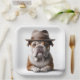 A bulldog is sitting calmly while wearing a stylish fedora hat isolated on a white background