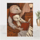 The image shows a warm scene of two ferrets, one adult and one young, sitting in a wooden armchair. The adult ferret, wearing a red and white scarf, holds a large book with a red binding, while the youngest, wearing glasses, is comfortably seated on his lap. The room is dimly lit by a lamp placed on a side table, throwing a warm glow on the stage.