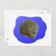 A photo of a young African Bullfrog sitting in a digitally created blue lake on a white postcard.