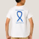 Bullying prevention awareness uses a blue ribbon for its cause awareness. The shirt art features a blue awareness ribbon painting. The awareness art t-shirt message notes "Bullying Prevention Awareness". There is a large image on the back of the shirt and a smaller picture on the front of the shirt.