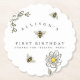 Cute yellow and white floral bee-themed birthday party coasters. Perfect for bumble bee birthdays. Unique hand-drawn flowers with buzzy bees and thanks for "beeing" here below the text. Easily edit to fit your own birthday party or special event.