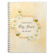 Elegant, fun summer baby shower celebrating a baby girl or gender neutral. Yellow, white background with a honeycomb pattern. On front: With a faux gold geometric frame. Decorated with light yellow, cream colored tropical florals flowers, hibiscus and happy bumble bees. With the text: Baby Shower written with a modern hand lettered style script. Template for the the mommy to bee and a date. Black letters. Perfect both for planning the party or as a Guest Book.