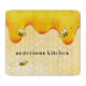 Yellow, white background with a bee honeycomb pattern and happy smiling bumble bees. Decorated with sweet, golden honey dripping. Personalise and add your name and monogram initials, golden and black letters. The name is written with a hand lettered style script. Perfect for your summer home!