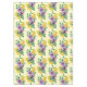 A cute bumblebee gently sits among two delicate lavender flowers and fresh green leaves, all set against a soft creamy yellow backdrop with yellow honeycomb design