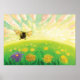 Bumblebee on the Horizon - Book illustration from children's book The Buzzing Bumblebee (Written and illustrated by Julia Doria). Early morning wildflower meadow. With rays of the morning sun bumblebee flies over a meadow with flowers. Bumblebees (of the genus Bombus) are important pollinators. Bumble bees pollinate plants in nature, helping to keep our ecosystems healthy. Loss of bumble bees can have ecological consequences. Perfect gift for bumblebee and bee lovers, Bee Keepers and nature lovers.