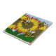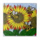 A tile with three funny bumblebees buzzing around big bright yellow and orange sunflowers.