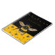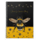 Gardening notebook to personalise with a title. Black and golden yellow, with bumblebees design. A single large bee is featured. A row of bumblebees across the top, with more bees making a patter over the yellow at the bottom of the cover.