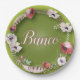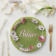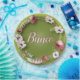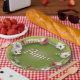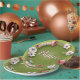 Bunco paper goods to add an extra design element to your next Bunco party. Features lovely wreath comprised of Bohemian style feathers and flowers. Green gradient background with the text "Bunco". Perfect for serving food at your next Bunco event.