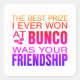 Modern typography style text for your Bunco best friend. Bunco dice sentiment reads: The best prize I ever won at Bunco was your friendship. Colourful and made just for Bunco players.